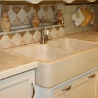 Cucina country in legno massello laccato bianco. Il piano è in marmo botticino con particolare gioco di piastrelle nello schienale. La cappa, bombata, è dipinta a mano in giallo perlescente.