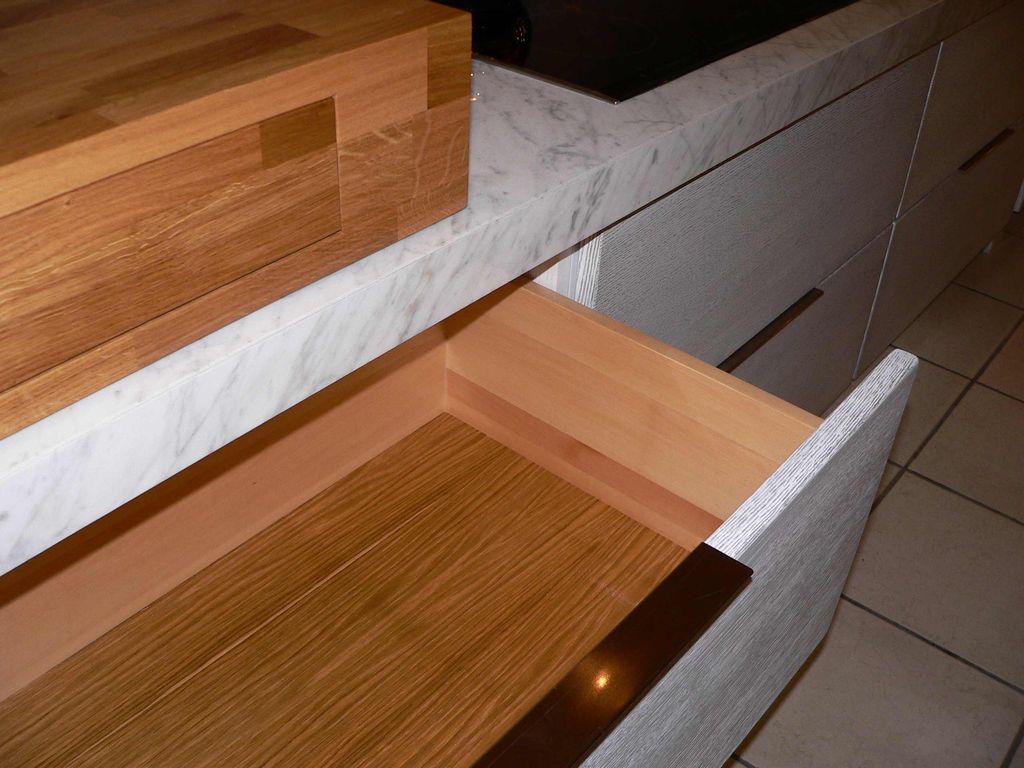 Cucina in rovere laccato con piano e schienale in marmo di Carrara, per chi ama sobrietà e colori neutri, adatta ad ambienti che ridefiniscono il concetto di chic.