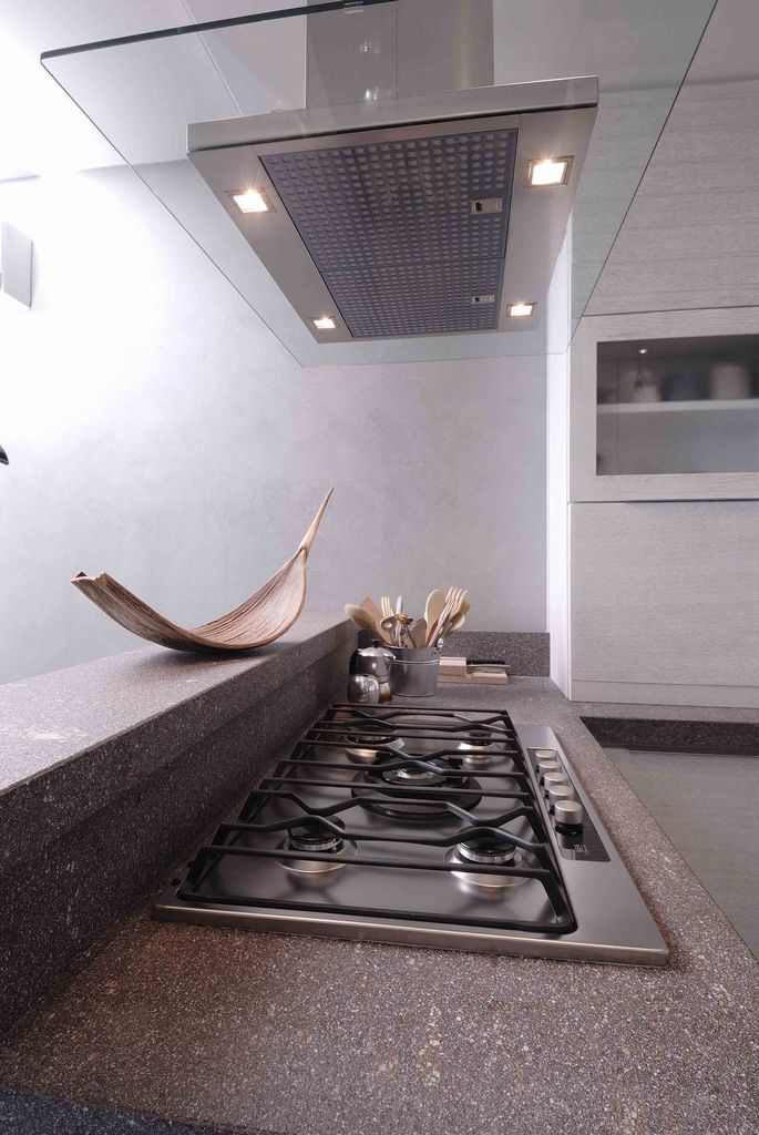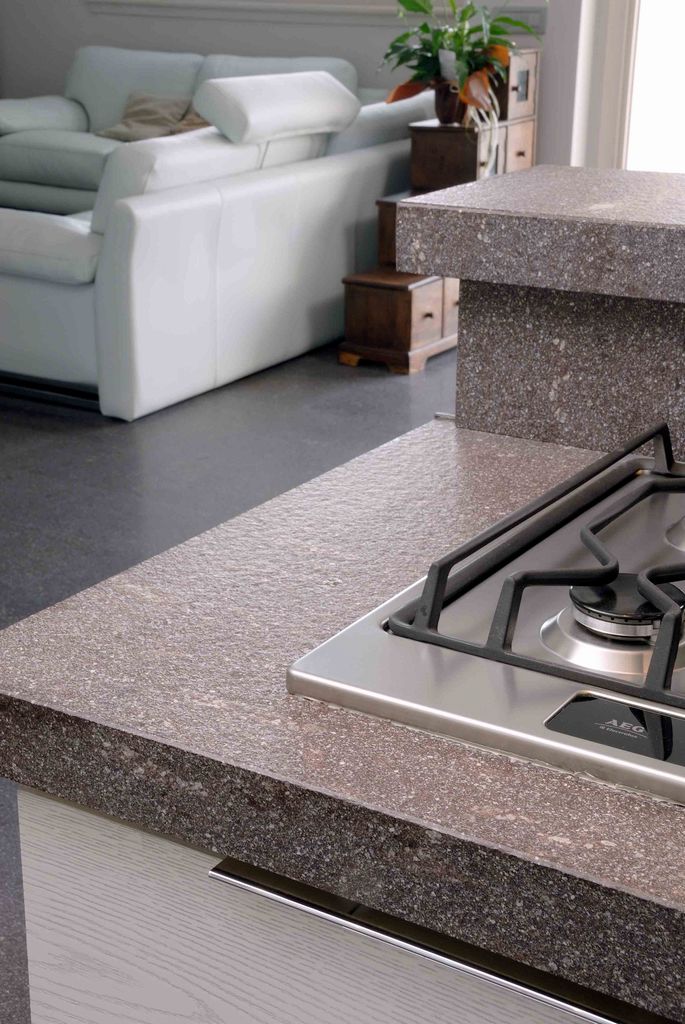Cucina moderna in rovere laccato con piano e schienale in porfido, per chi ama sobrietà e colori neutri, adatta ad ambienti che ridefiniscono il concetto chic.